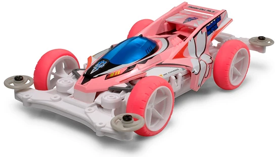 It was equipped with the white, large-diameter 5-spoke lightweight narrow wheels paired with the fluorescent pink arched tires. The center chassis frame and the A parts were molded in the white regular ABS plastic, while the nose and tail units were molded in the white glass fiber-mixed ABS plastic. It comes with the gray rollers.